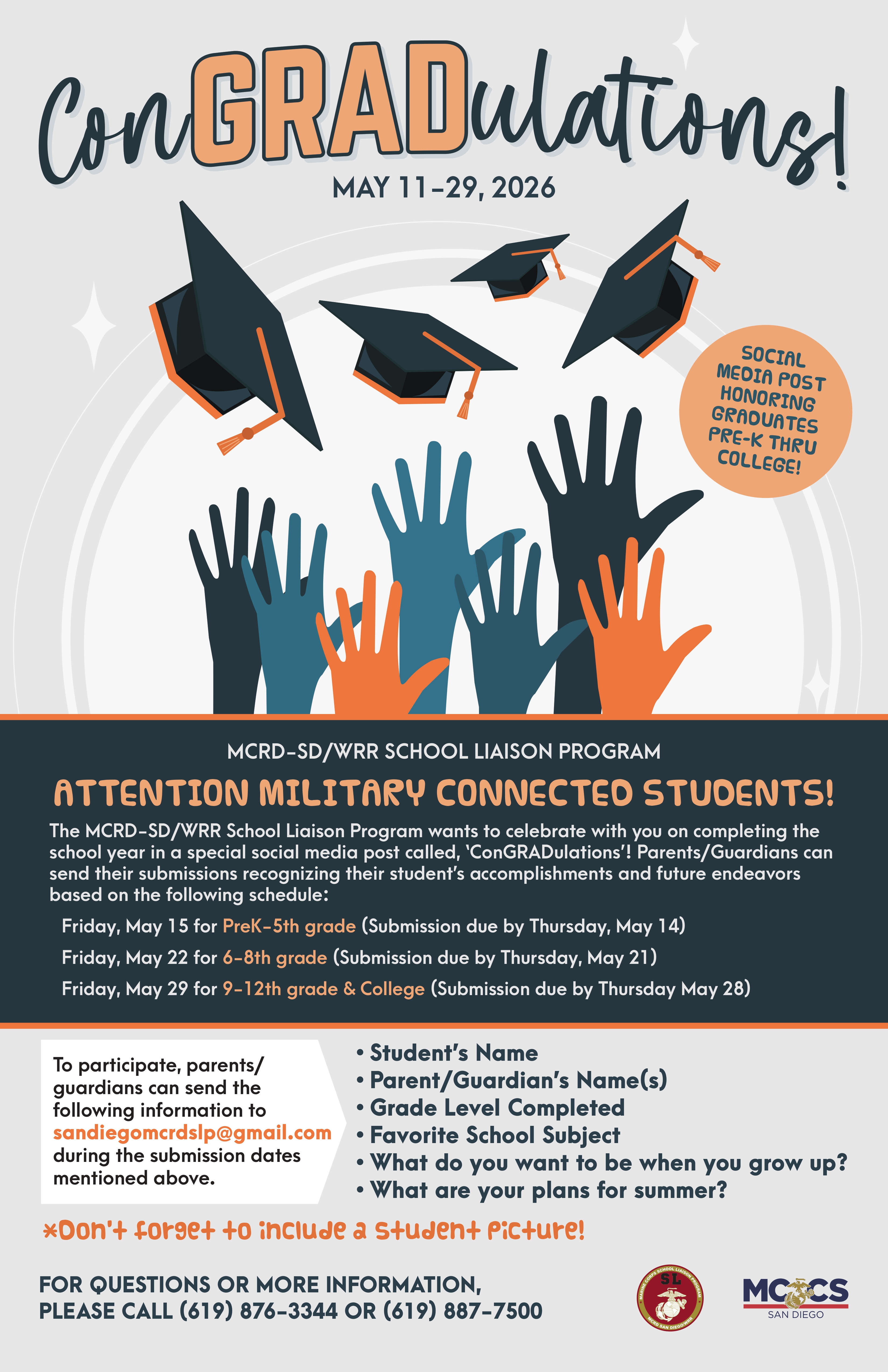 Attention military-connected students! The MCRD-SD/WRR School Liaison Program wants to celebrate with you on completing the school year in a special social media post called, 'ConGRADulations'! Parents/Guardians can send their submissions recognizing their student's accomplishments and future endeavors based on the following schedule: