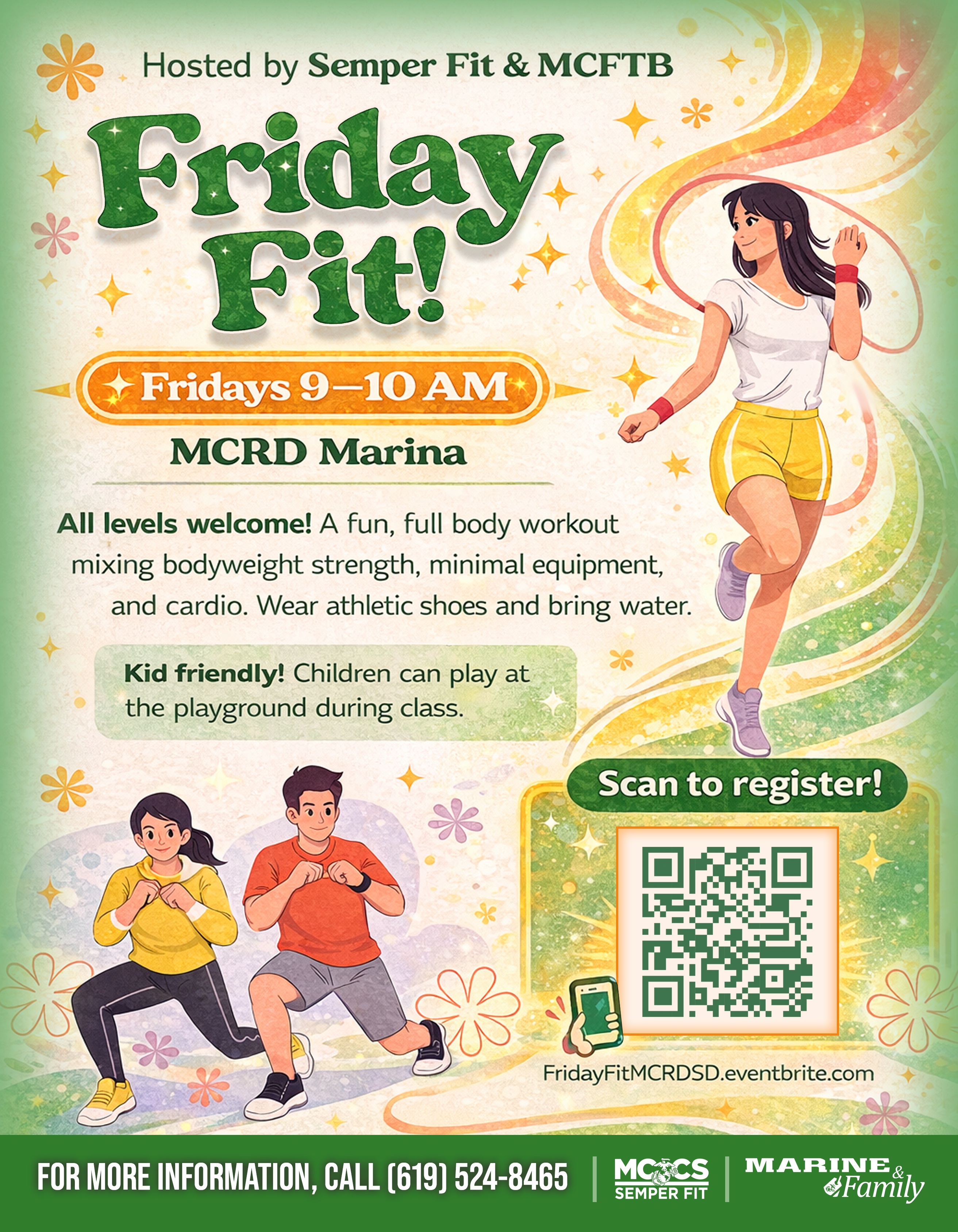Join Marine Corps Family Team Building (MCFTB) and Semper Fit for a fun, full body workout at the Marina/Bayview Lawn every Friday morning from 9:00 am - 10:00 am. During inclement weather, classes will be held inside the Jerry Coleman Center.