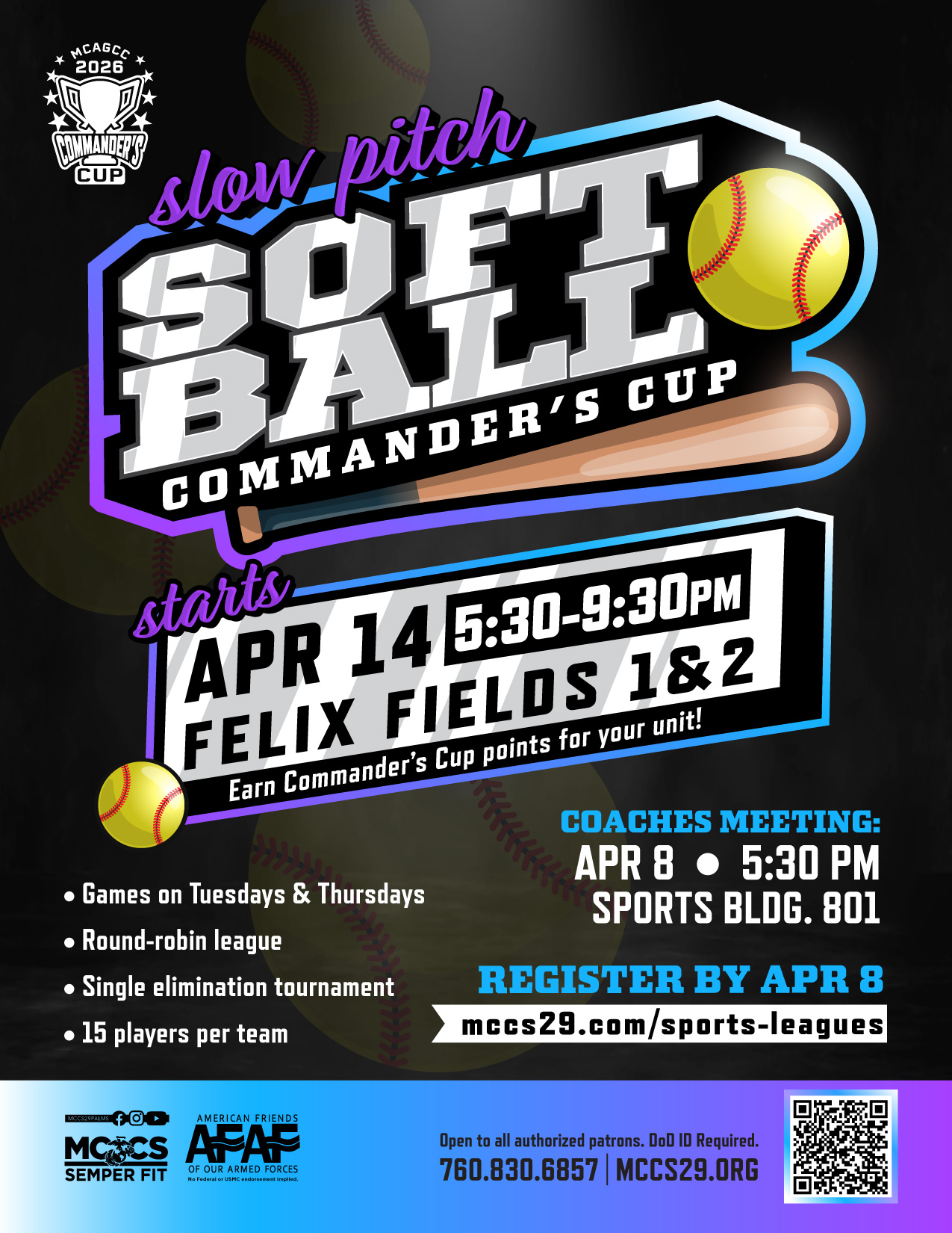 Free and open to all authorized patrons. DOD Civilians must be cleared by sports office in order to participate. Civilians and non-active duty must pay $20 player fee for the season before being cleared to play.