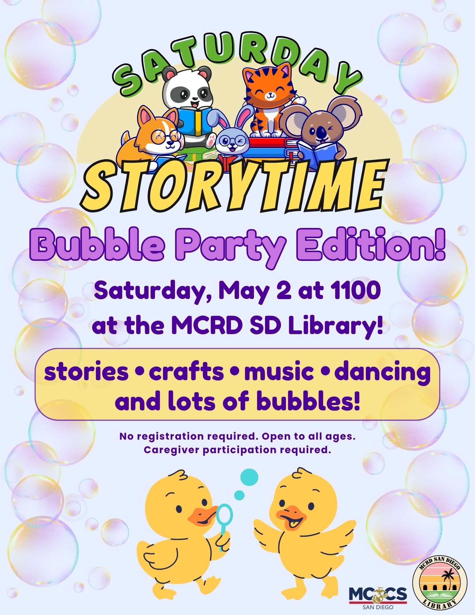 Join us for a special edition of Saturday Storytime – Bubble Party! Enjoy stories and lots of bubbles! No registration required. Open to all ages. Caregiver participation required.