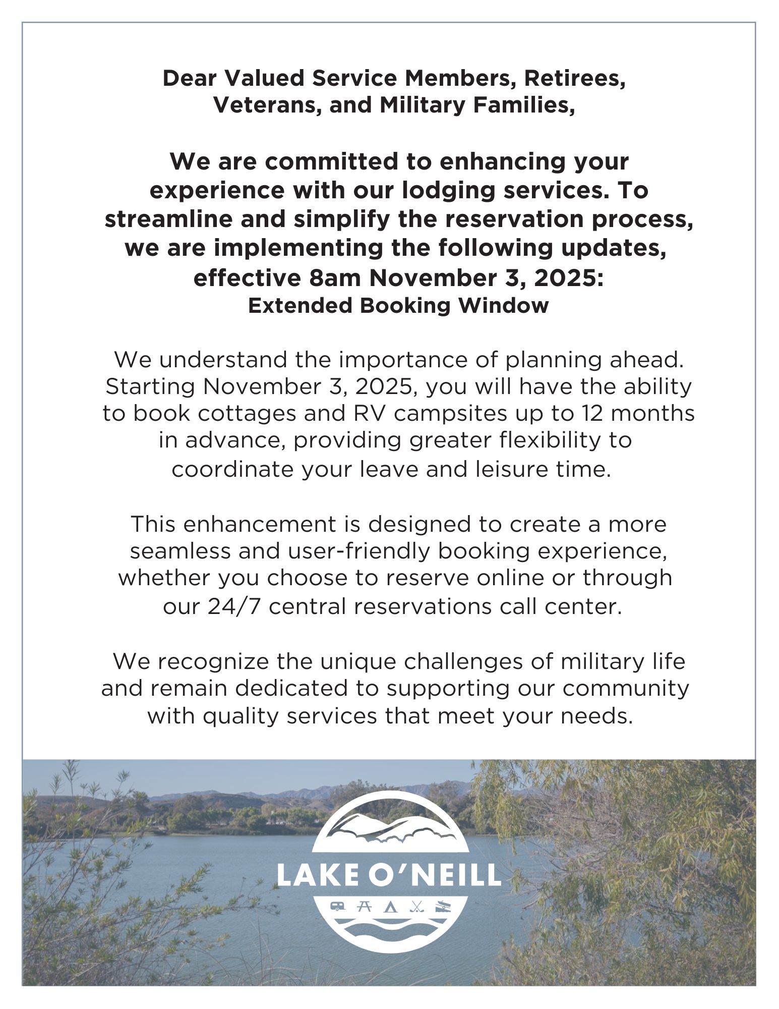 Reservations are taken in 3 month increments including current month.- 1st Week (Days 1-7) – Active Duty Military